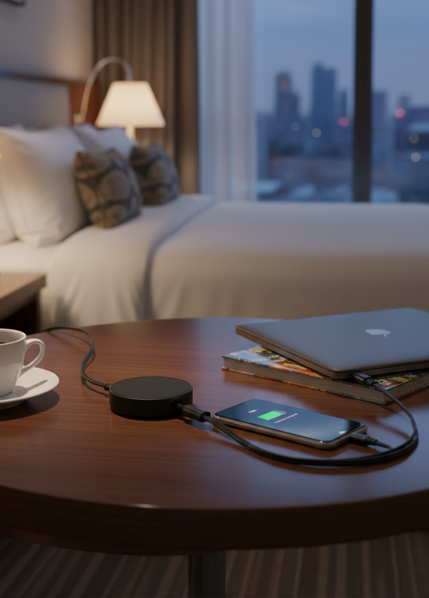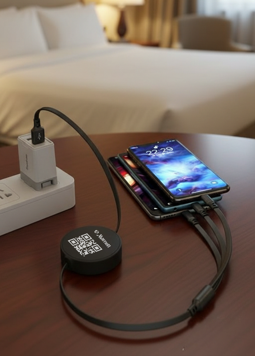 Yotool provides hotels with a unique 3-in-1 retractable charging cable, fully customizable with your hotel logo and a unique QR code. Every time a guest charges their device, they are guided effortlessly to your review page such as Google and Tripadvisor. A simple daily routine becomes a powerful marketing moment.