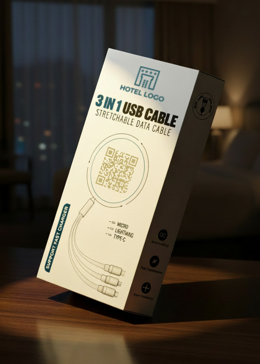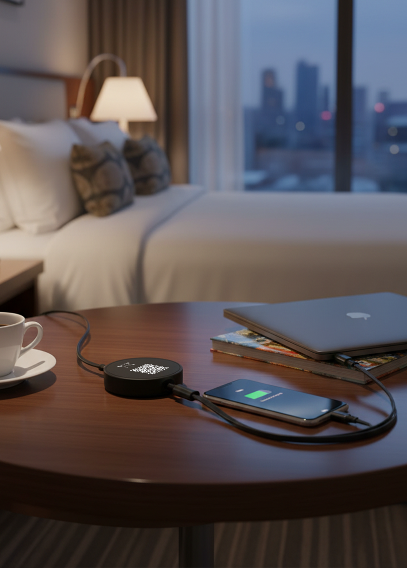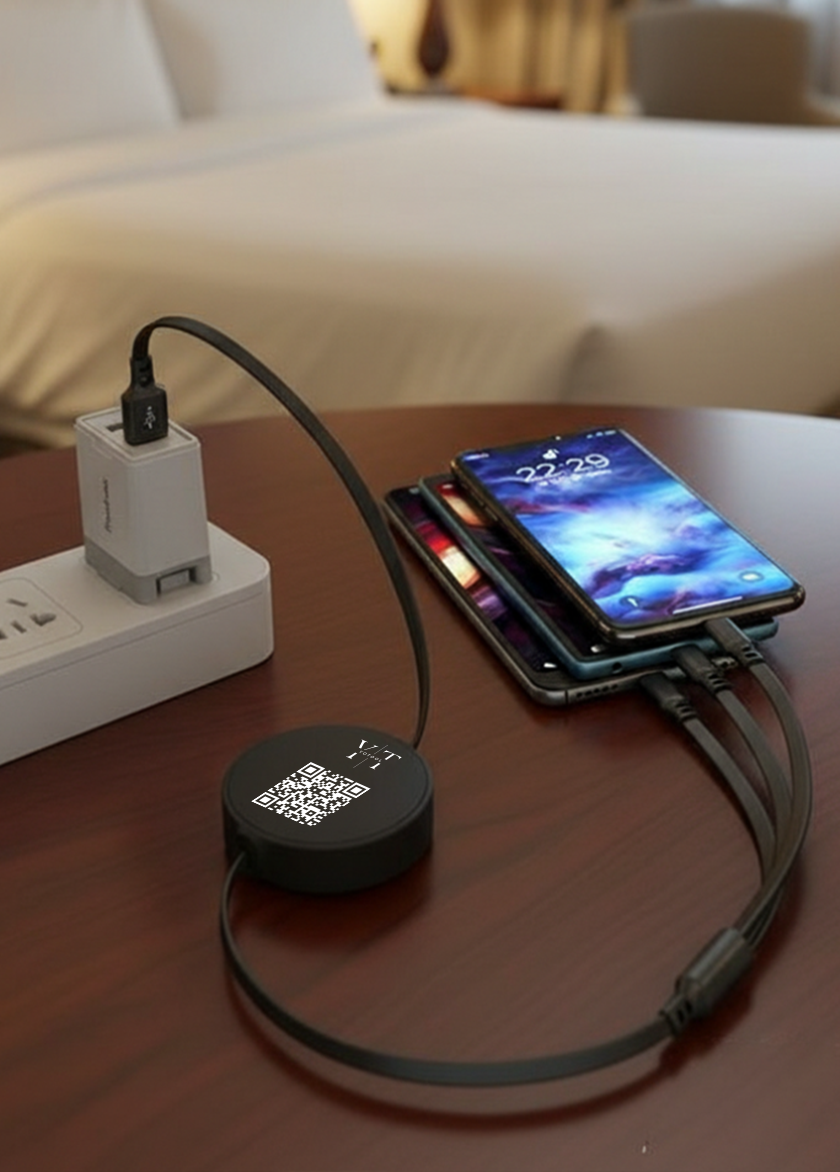 Yotool provides hotels with a unique 3-in-1 retractable charging cable, fully customizable with your hotel logo and a unique QR code. Every time a guest charges their device, they are guided effortlessly to your review page such as Google and Tripadvisor. A simple daily routine becomes a powerful marketing moment.
